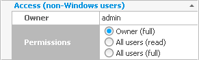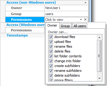 The owner of the folder can be selected in the Folder Properties section of the Folders panel. The folder's group can be selected from the list of user groups. Any non-Windows user who is a member of that group will be granted the permissions that group has on the folder. Finally the permissions are shown. Click on "[Click to view]" and a popup will display the permissions for the folder's owner, group, and for all users. The permissions themselves are self-explanatory.