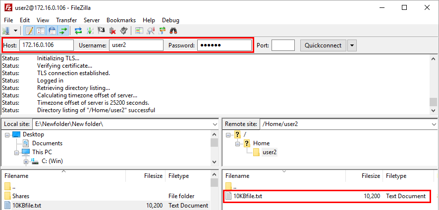 Now connect to the remote server as 'user2' and you will see the same file has also been uploaded to this account's home folder.