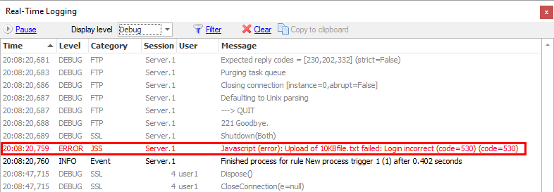 3. Now we can check the CompleteFTP logging and get the error log, in the format we set in catch block.