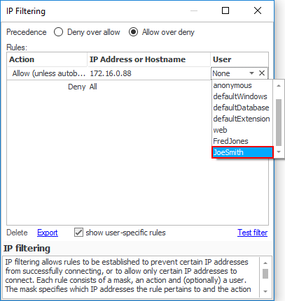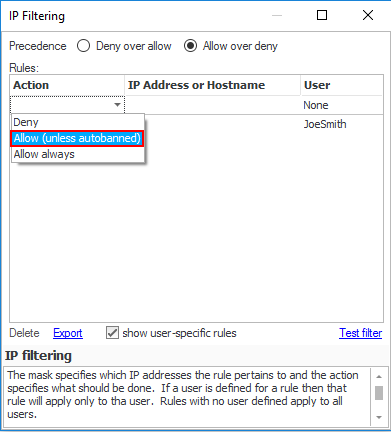 Why? If no rule applies to an incoming connection, then the first part of the precedence is used (i.e. 'Deny' for 'Deny over allow' and 'Allow' for 'Allow over deny'). Therefore, in this example, unless the user-specific rules that will be defined below apply, then an incoming connection will be allowed (Remember, in this example we are using the 'Allow over Deny' precedence).