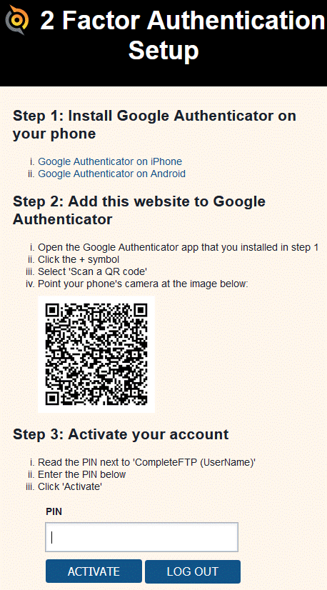 The first time users log in after 2FA has been enabled, or after their activation status has been reset by an administrator, they'll be presented with a page showing (1) instructions on how to install the Google Authenticator app on their iPhone or Android phone and (2) a QR code for the site. Once they're up and running with the app they'll need to scan the QR code to register the site. Immediately after they've done this a 6-digit PIN will be displayed inside the app. They must enter this PIN on the web page and click the 'Activate' button. Once they've done this they'll be granted access to the site.
