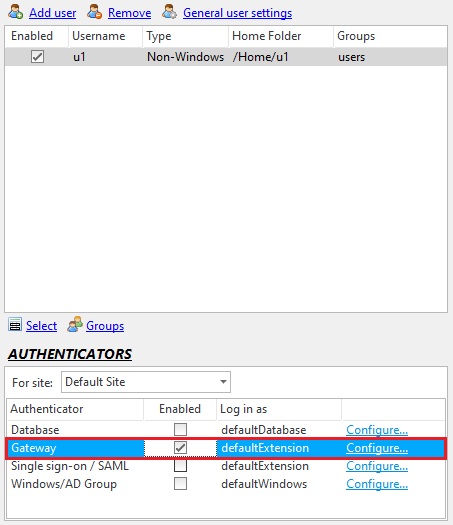 Gateway users require a gateway authenticator to be configured to allow users to be authenticated using a different server. This is a feature of the Enterprise MFT only of CompleteFTP.