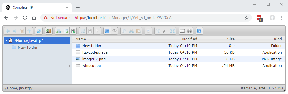 CompleteFTP supports HTTP and HTTPS (Professional and Enterprise MFT) and is a capable web-server in its own right. It includes two file-manager web-apps. The original file-manager, added in version 7.2, is similar in style to the Macintosh Finder application, and as such is suitable for desktop/laptop environments. The newer file-manager, added in version 12.0.0, is a more modern responsive web-app that works well both on computers and on mobile devices. Screenshots of both are included below: