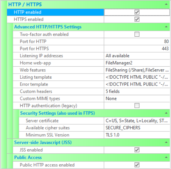 | Public HTTP access enabled | If checked, unauthenticated users will be able to access any file in the public folder. Unauthenticated users are represented by the user called 'anonymous' (which can be found in Users panel and by selecting "Show system users/folders/sites" in the main form's Options menu). By default the home-folder of this user is /Public, so this is the folder that will be publicly accessible if this option is enabled. |