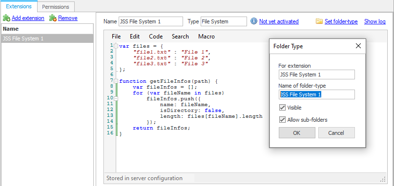 General instructions on writing CompleteFTP JSS extensions may be found here. Remember that file-system extensions are linked to the file-system via a folder-type, so an entry for the file-system extension being developed must be present in the folder-type tab, before a folder of that type may be added to the virtual file-system. It's created automatically but it's important to understand this linkage. Once a folder-type has been created the file-system extension may be tested by creating a folder of that type in the virtual file-system, and then listing that folder using a client such as FileZilla.