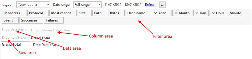 Filter Area: Fields here allow you to filter the data that's displayed in the grid. For example, if you only want to see data for a specific user, you can drag the User-name field to the filter area and select the desired user.