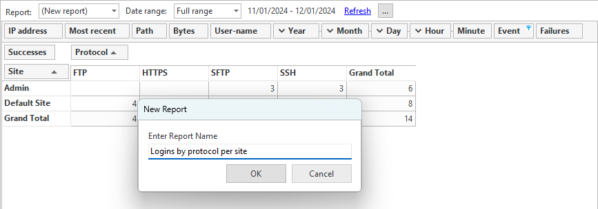 Save the report with a descriptive name, such as "Logins by protocol per site".