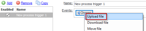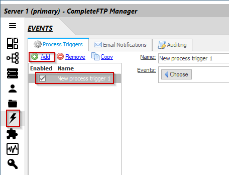Open CompleteFTP Manager and select the Events tab. In Process Triggers panel click on the 'Add' button to add a new event.