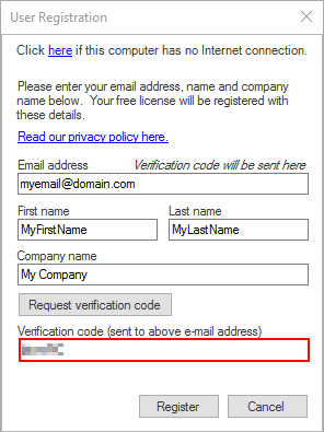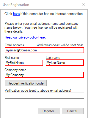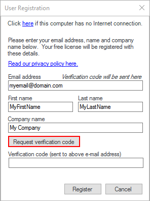 2. Enter a valid e-mail address, your name and, optionally, the name of your company.