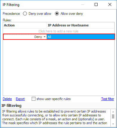 In the 'IP Filtering dialog', select the 'Allow over deny' radio button.