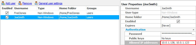 Now, only the 'JoeSmith' user from the specified IP addresses can connect to the CompleteFTP server (check the
