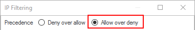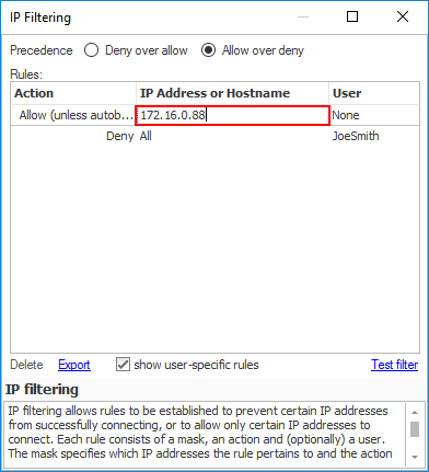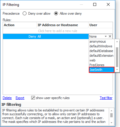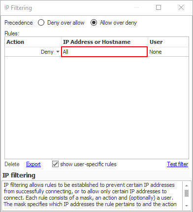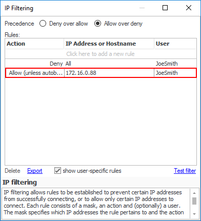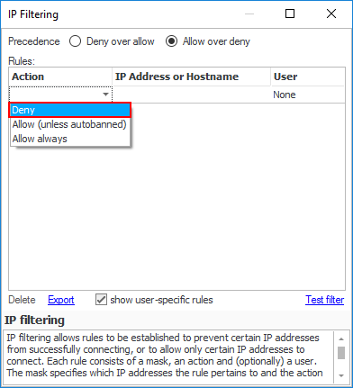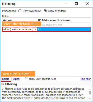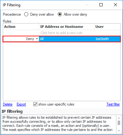 Why? If no rule applies to an incoming connection, then the first part of the precedence is used (i.e. 'Deny' for 'Deny over allow' and 'Allow' for 'Allow over deny'). Therefore, in this example, unless the user-specific rules that will be defined below apply, then an incoming connection will be allowed (Remember, in this example we are using the 'Allow over Deny' precedence).