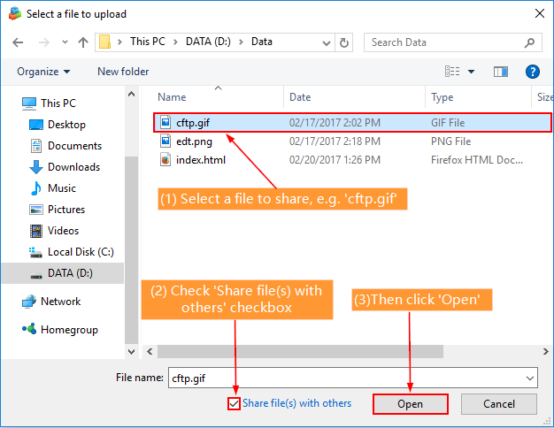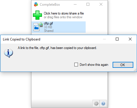 Once selected, the files will be shared on the file sharing server via a secure connection. A public link to the file is