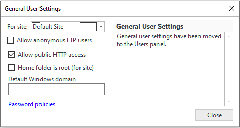 Password policies can be found by selecting the "Password policies" link on the General User Settings dialog box, and are described here.